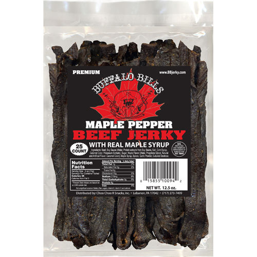 After vacationing in Vermont in 2010, Buffalo Bill went back to Pennsylvania with this enticing variation on Buffalo Bills classic Premium Hickory Beef Jerky. Using real maple syrup with an added bite of fresh cracked black pepper, this inspired flavored combo has quickly become a national hit. Buffalo Bills Premium Maple Pepper Beef Jerky is a "hung in the smokehouse", whole muscle beef jerky and is available in 5 package sizes: 12.5oz strips, 16oz pieces, 8oz pieces, 2.6oz packs, and 1.5oz packs.